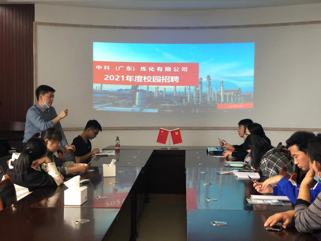 导航痕迹 当前位置: 首页 >> 招生就业 >> 招聘信息 >> 正文 中科(广东)炼化有限公司来我院开展专场招聘会 作者:梁精华 发布日期:2020-10-14 浏览次数: 10月14日,中国石化中科炼化有限责任公司来到我院召开专场招聘会。招聘会在雁山校区12栋萃华楼12217多功能厅召开,我院化学工程与工艺、应用化学专业共计30名在校毕业生参加招聘会。 宣讲会伊始,同学们共同观看了中国石化中科炼化有限责任公司宣传片。接着,企业代表从公司概况、组织架构、福利待遇、日常生活、当地政策等方面做了详细介绍,并针对同学们提出的问题进行了相应解答。 据悉,中国石化中科炼化有限责任公司是中国石油化工集团有限公司旗下子公司,经营业务包括原油进口、加工;石油产品、石化产品的生产、储存、销售;食品添加剂硫磺的生产、储存、销售;成品油出口,来料加工;自用码头、油库的建设、经营;油品储存;产品运输配套服务,是一家集研发、生产、销售新能源材料(锂离子电池电解液、铝塑膜)于一体的国家高新技术企业。 中科(广东)炼化负责人为毕业生作招聘宣讲 招聘宣讲会现场 上一条:广西梧州中恒集团股份有限公司到我院洽谈合作事宜并开展专场招聘毕业生活动 下一条:诺德投资股份有限公司来我院开展专场宣讲会